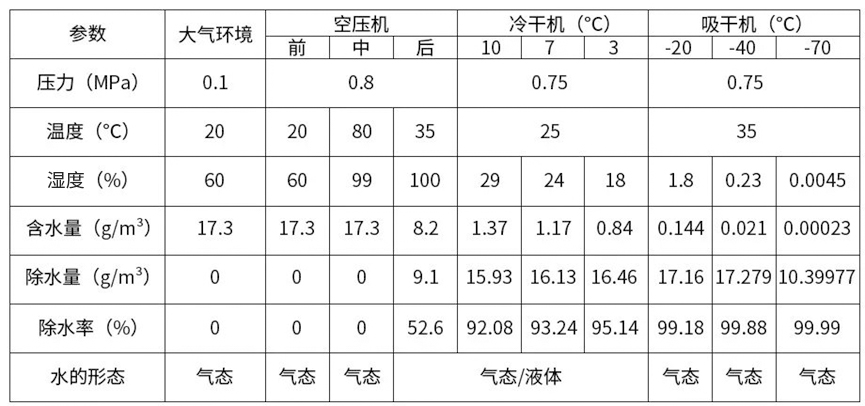 壓縮空氣中的水通常以液態(tài)水和氣態(tài)水兩種形態(tài)存在,且相互可以轉(zhuǎn)化,這就導(dǎo)致壓縮空氣穩(wěn)定可靠的除水成為世界性的難題,通過下表可以清晰看到壓縮空氣水含量在空壓系統(tǒng)中的變化情況: