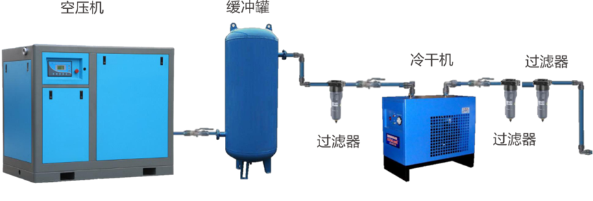 液態(tài)水的解決措施:后部冷卻器、氣水分離器、儲(chǔ)氣罐、冷干機(jī)、過濾器等組合攔截分離方法、去除液態(tài)水(無法解決氣態(tài)水)