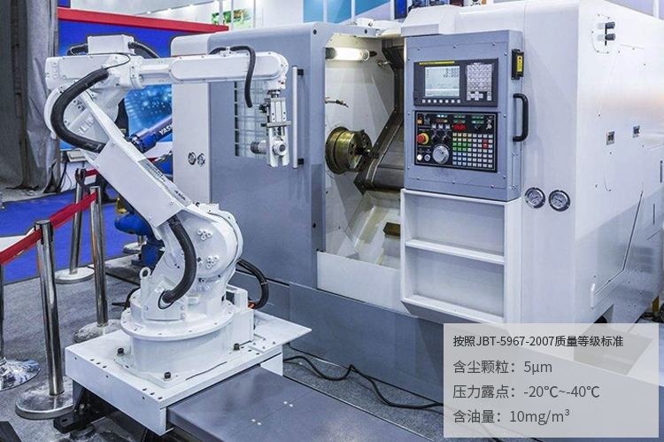 對(duì)于一臺(tái)數(shù)控機(jī)床或加工中心的壓縮空氣用氣量不是很大,可能只有0.5m3/min左右,總的用氣量要根據(jù)加工設(shè)備的數(shù)量,其壓力要求為0.6~0.7MPa,設(shè)備對(duì)壓縮空氣品質(zhì)的要求也不高,特別是對(duì)油的含量要求不高,對(duì)水的要求是壓力露點(diǎn)為10℃。這里的后處理設(shè)備一般需要配置干燥機(jī)及過濾器。