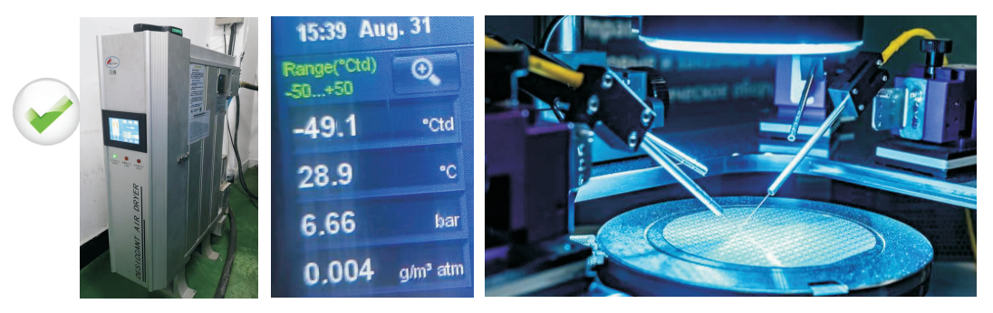 某半導體封裝封企業(yè),生產中應用了25萬美元的進口低溫探針臺,該設備要求壓縮空氣露點必須小于等于-60℃,原使用的后處理設備為“冷干機+微熱型雙塔吸干機”,露點很難穩(wěn)定,無法滿足低溫測試設備的用氣品質要求,給生產造成極大困擾。