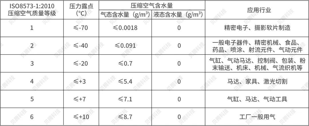 要準(zhǔn)確衡量壓縮空氣含水量的高低,就需要引入壓力露點(diǎn)概念,壓力露點(diǎn)指的是在0.7MPa壓力下的情況下,壓縮空氣里的含水量。ISO8573-1:2010和JB/T 5967-2007對(duì)壓縮空氣品質(zhì)標(biāo)準(zhǔn)規(guī)定如下: