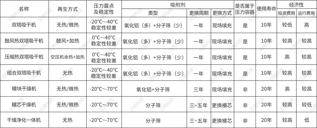 對(duì)壓縮空氣進(jìn)行干燥凈化是工業(yè)企業(yè)節(jié)約成本和保障高效安全生產(chǎn)的根本,吸附干燥是目前制備極低露點(diǎn)壓縮空氣的主要技術(shù),吸附干燥機(jī)也因此而發(fā)展成壓縮空氣深度除水的最主要的裝備,主要吸附式干燥機(jī)種類(lèi)如下表: